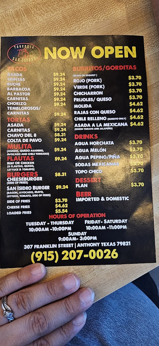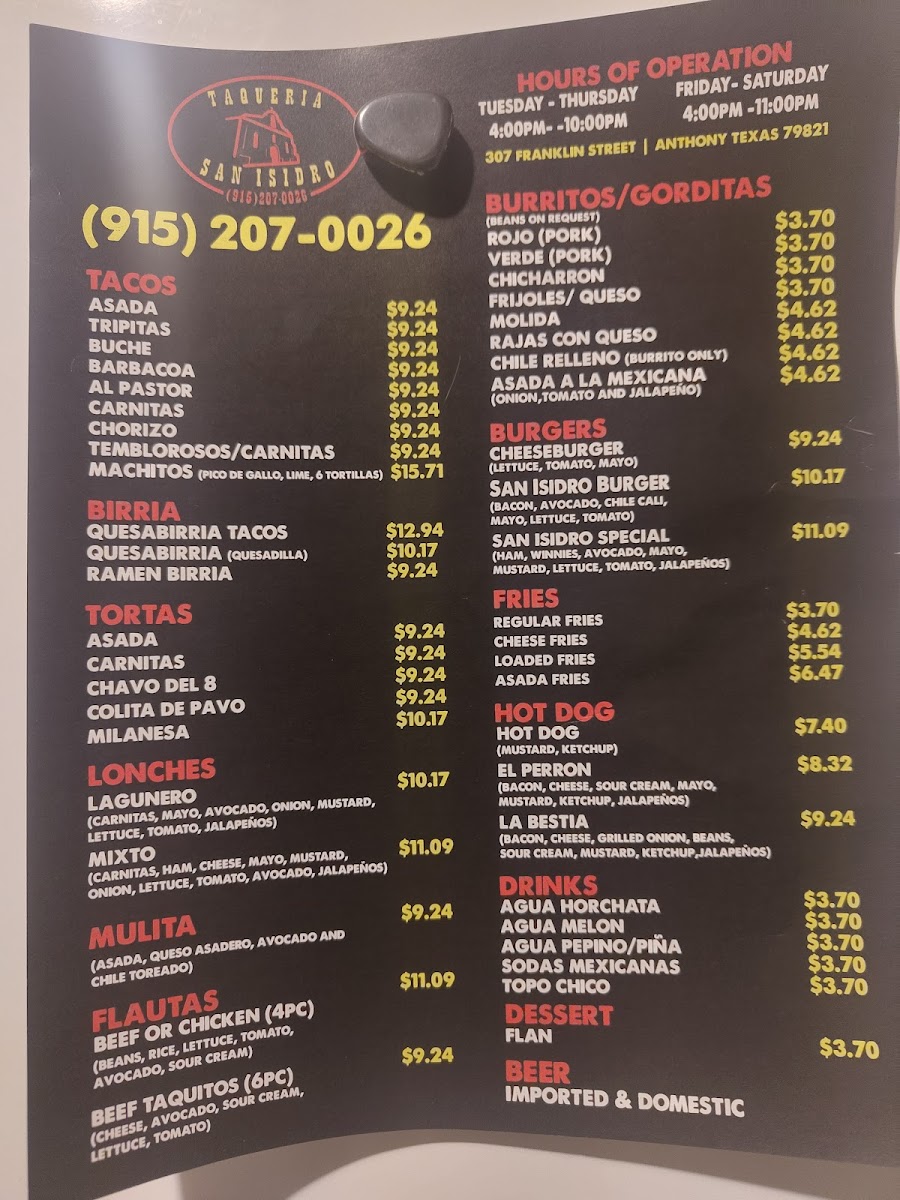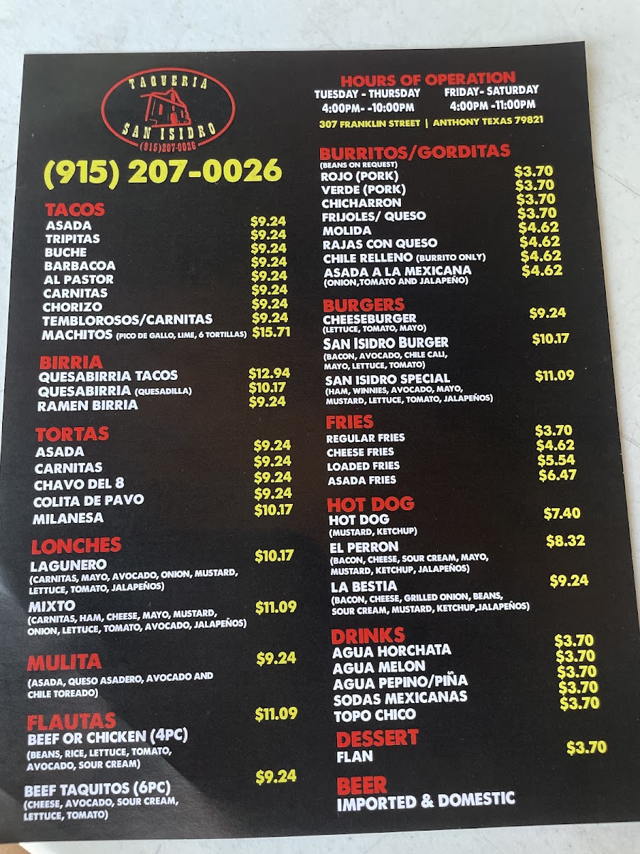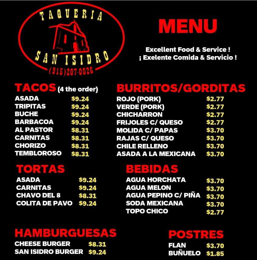 If you’re in the mood for authentic, mouthwatering Mexican flavors, the Taqueria San Isidro Menu has got you covered. Located at 307 Franklin St in Anthony, TX, this cozy spot is a local favorite for its bold, flavorful dishes. From sizzling tacos to flavorful burritos, each bite is a celebration of traditional Mexican cuisine. Whether you're craving a perfectly grilled carne asada taco or a fresh, crunchy ceviche, you’ll find something that hits the spot. The menu is packed with options that highlight fresh ingredients and homemade salsas that add that extra zing to every meal. Not to mention, the portions are generous, so you’ll definitely leave satisfied. If you’re nearby, it’s the perfect place to grab a quick lunch or enjoy a relaxing dinner with friends and family.